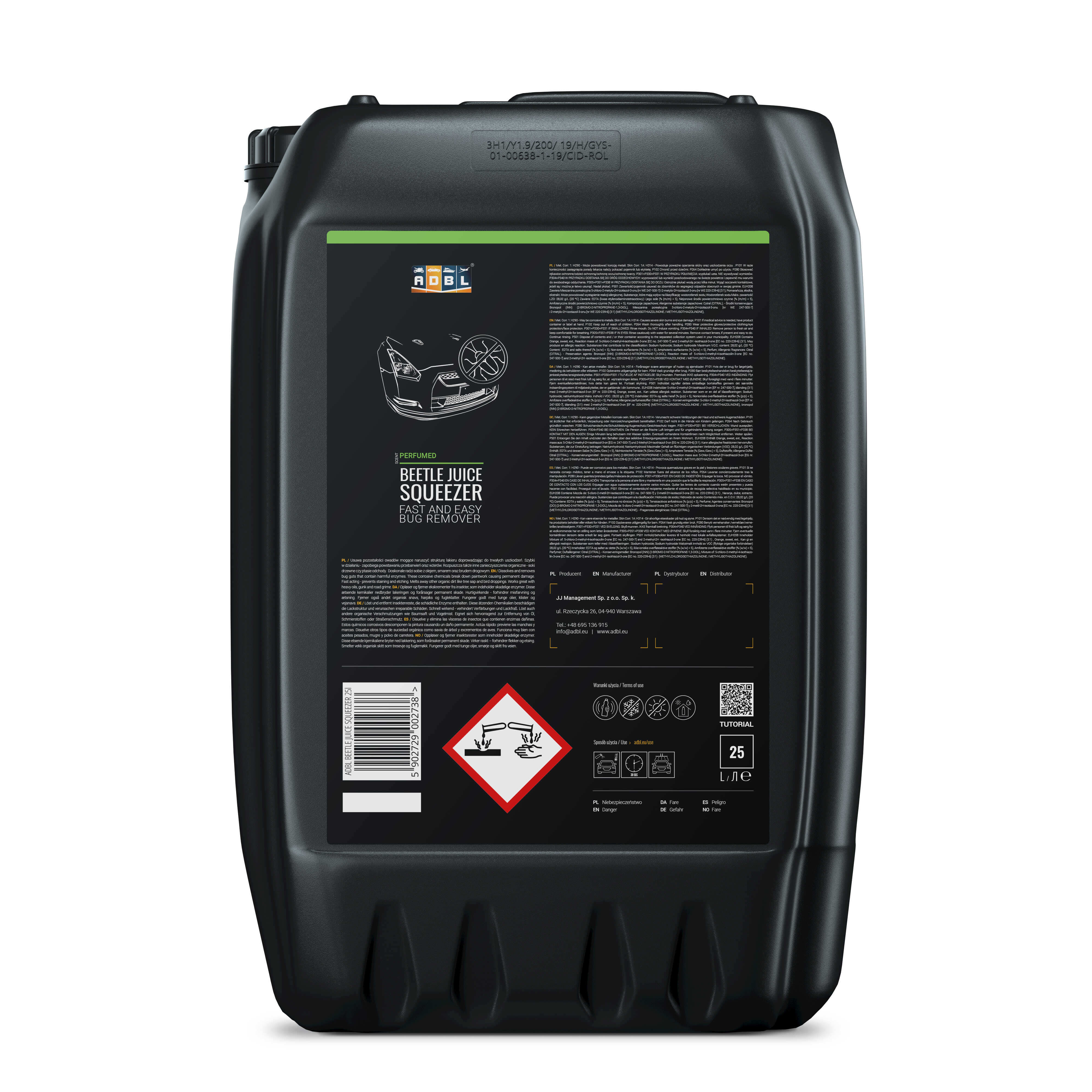 ADBL Beetle Juice Squeezer is a powerful, fast-acting cleaner designed to dissolve and remove bug residue containing harmful enzymes that can damage paintwork. It also effectively eliminates tree sap, bird droppings, heavy oils and road grime, preventing staining and etching while keeping surfaces safe.