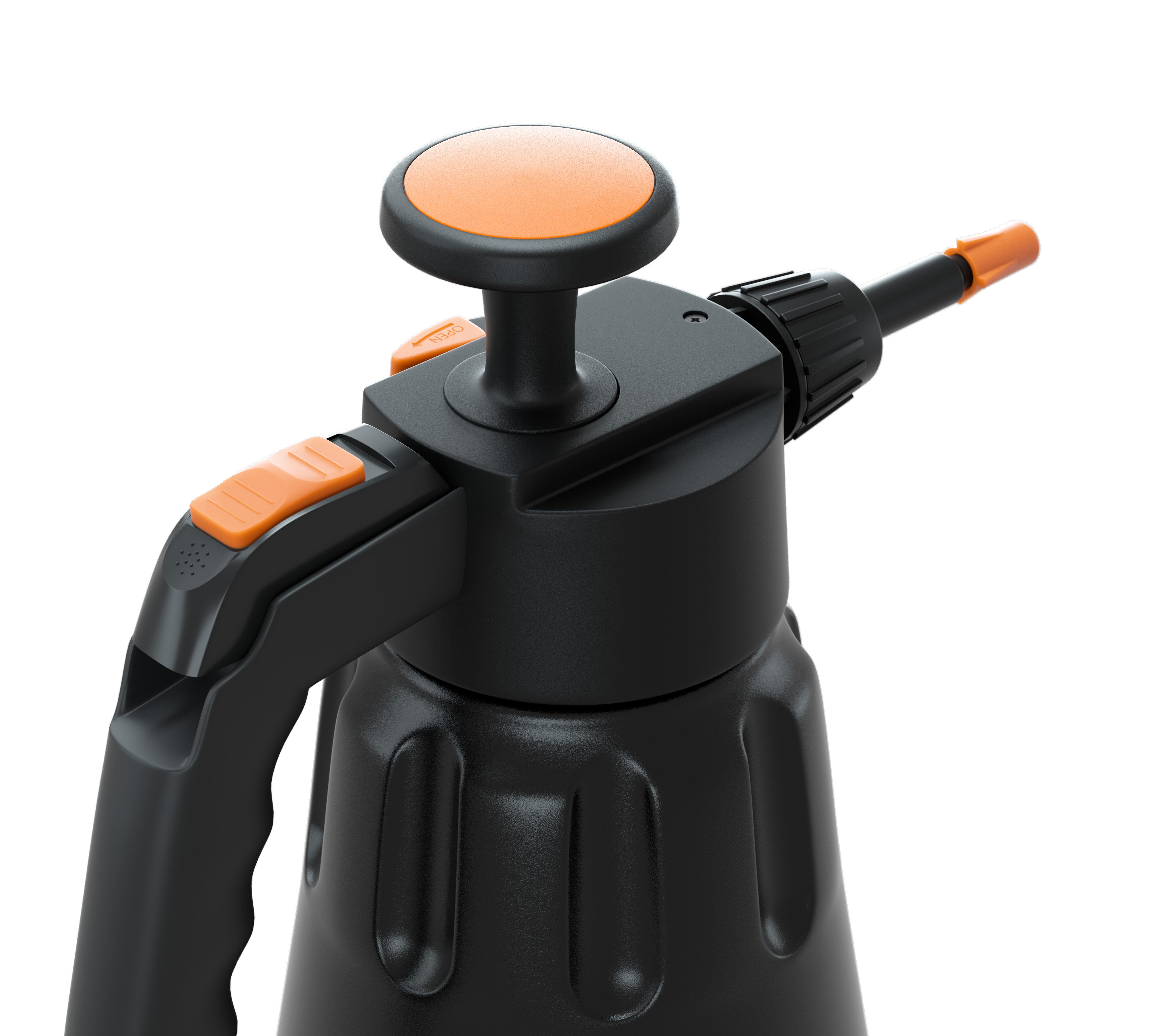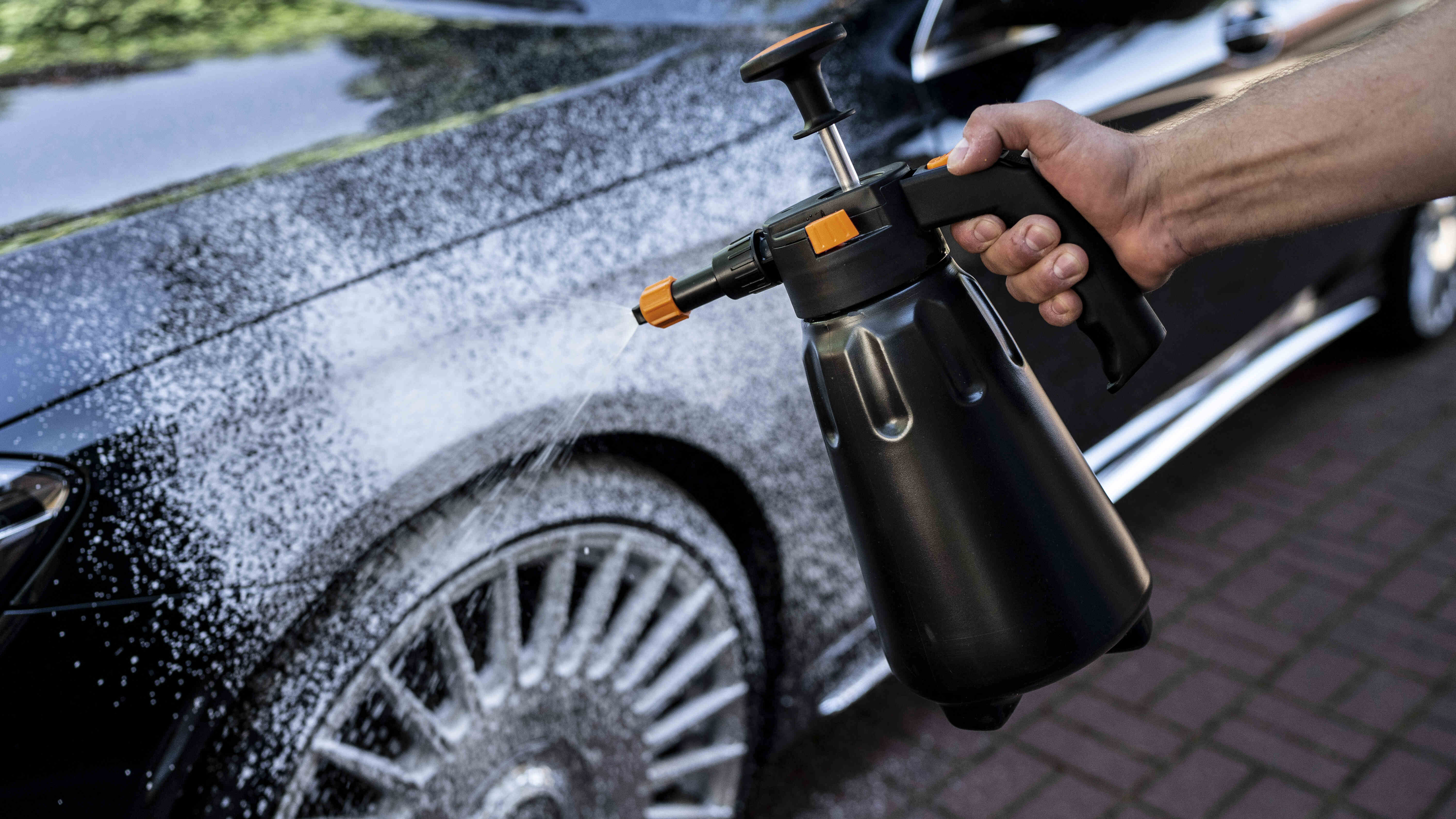 Hand-pump pressure sprayer made from durable plastic, designed for use with detailing products. Equipped with Viton® seals for long-lasting performance, it features an adjustable spray stream for precise application. The 360° system allows operation at any angle, and the convenient trigger lock ensures comfortable use in all conditions. A built-in pressure release valve makes opening the sprayer effortless.